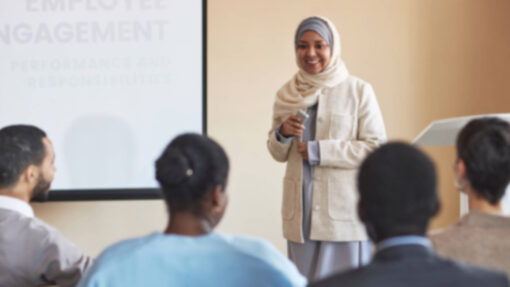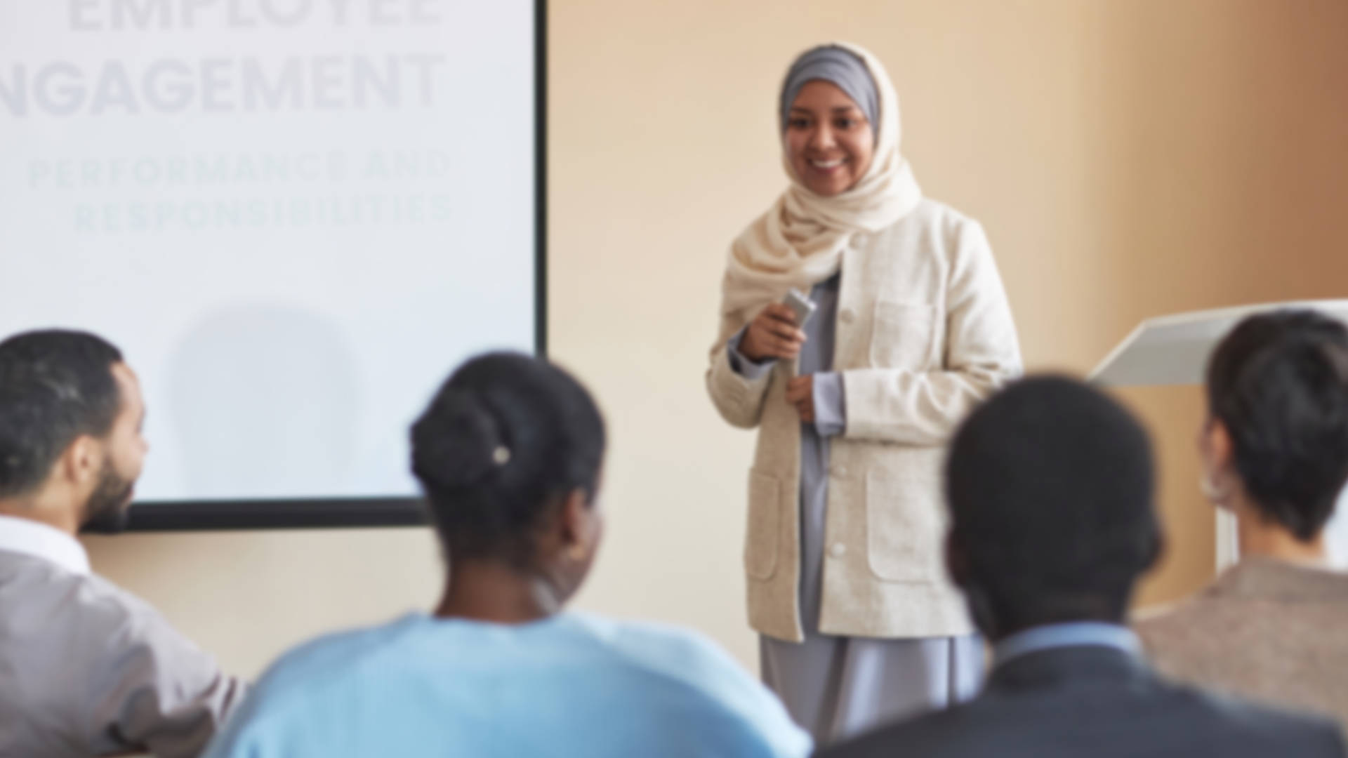 Happy young Muslim woman in hijab and blazer standing in front of audience