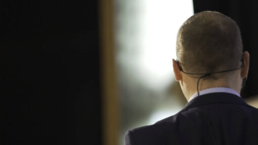 Rear view of speaker in suit giving a talk on corporate Business Conference. Stock. Public speaker making a speech on blur background.