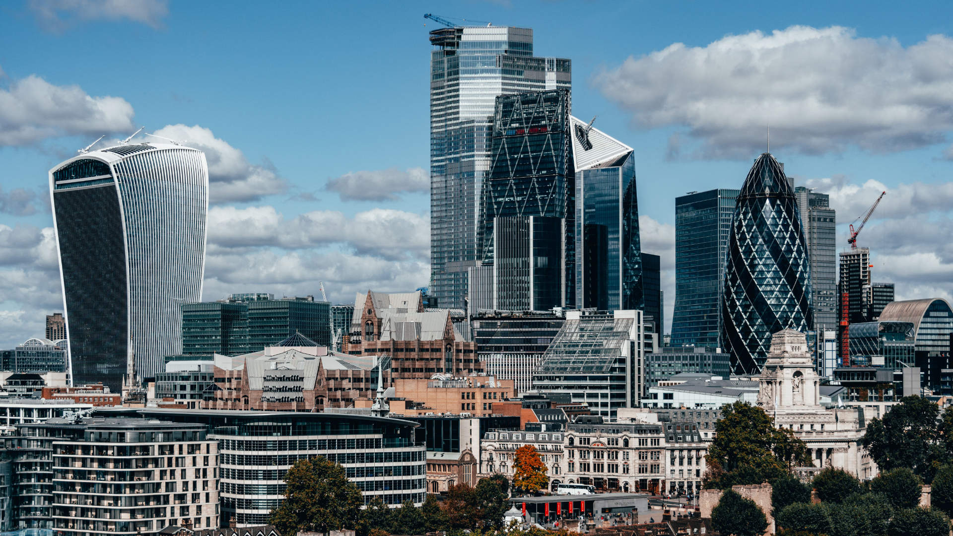 Skyline of London’s financial district featuring iconic skyscrapers under a blue sky with clouds