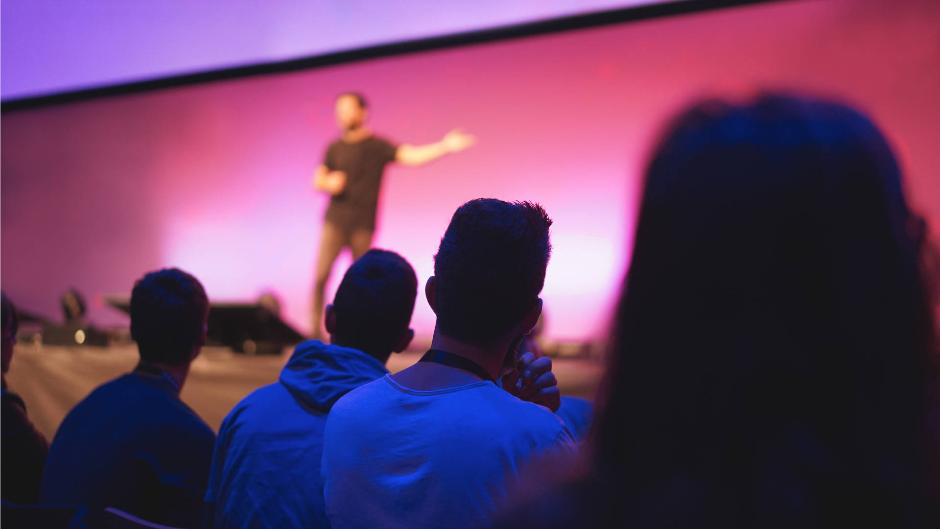 Speaker giving conference speech to audience at public event - Focus on right man back